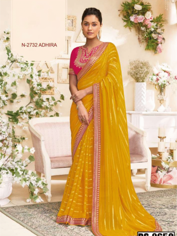Adhira N-2732 yellow designer saree with pink embroidered border and blouse. A bright, festive choice for haldi ceremonies, poojas, and daytime events.