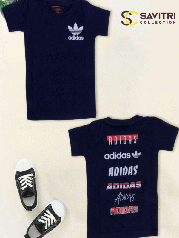 Comfort meets style in this Adidas-inspired navy blue kids’ t-shirt set, featuring unique multi-style branding and matching sporty shoes for a trendy and practical outfit.