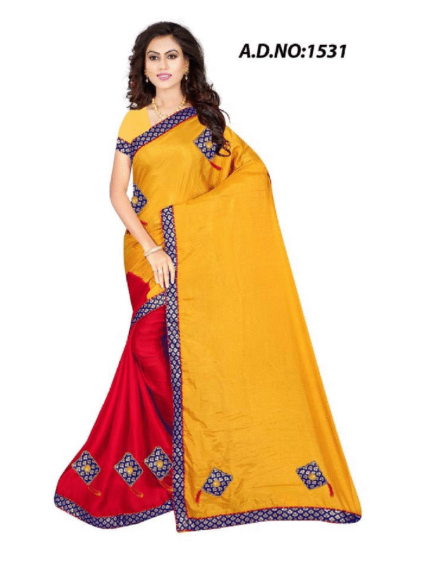 Elevate your ethnic style with A.D. No:1531 dual-tone silk saree in mustard yellow and red, featuring elegant motif designs, a contrast border, and a matching blouse — perfect for festive occasions and traditional celebrations.