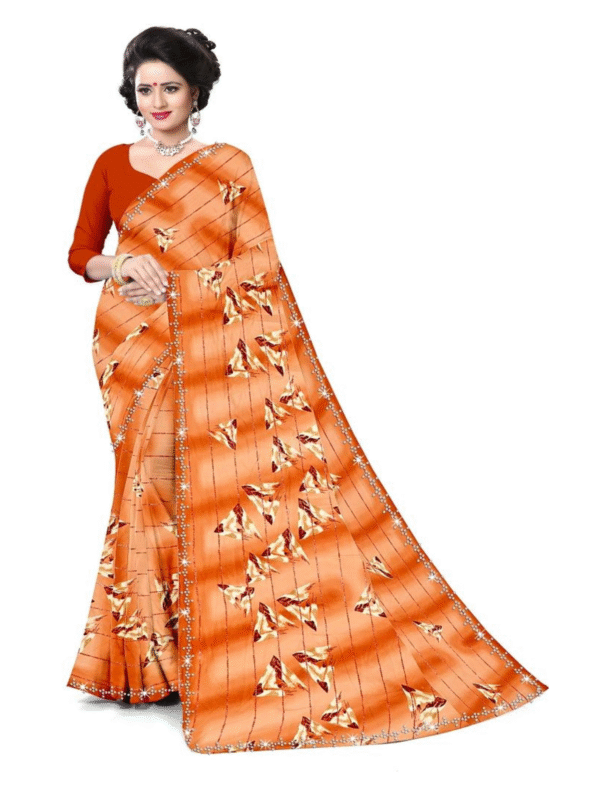 Stylish amber-orange printed saree with a soft drape and elegant design — perfect for festive occasions, parties, and celebrations.