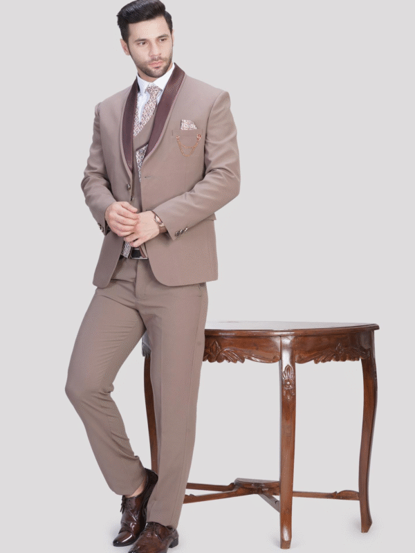 Coffee Brown Imported Three-Piece Suit with satin lapel, waistcoat & trousers – perfect for weddings, parties, and receptions.