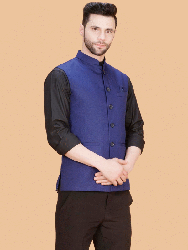 Stylish Royal Blue Waistcoat (SNA-MWC12114) with premium imported fabric, mandarin collar & versatile design. Perfect for weddings & parties.