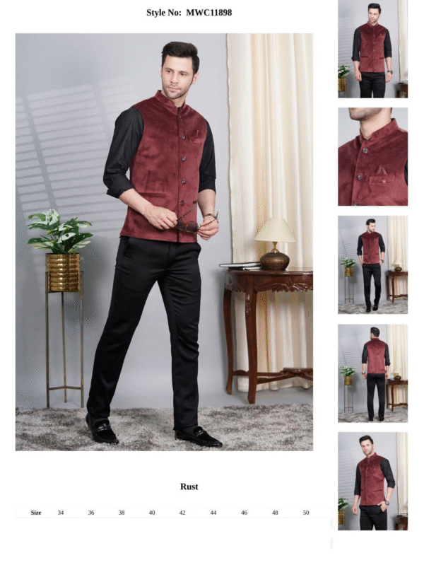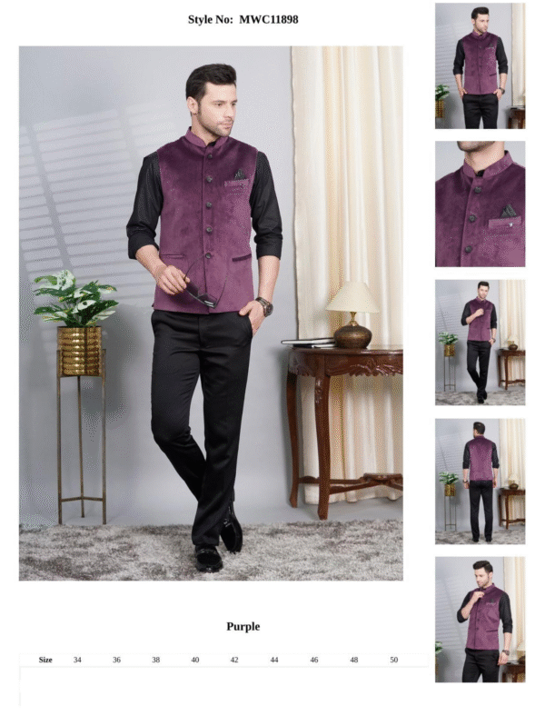 Royal Purple Suede Waistcoat (MWC11898) with mandarin collar and pocket square. A versatile piece for weddings, festive wear, and evening parties.