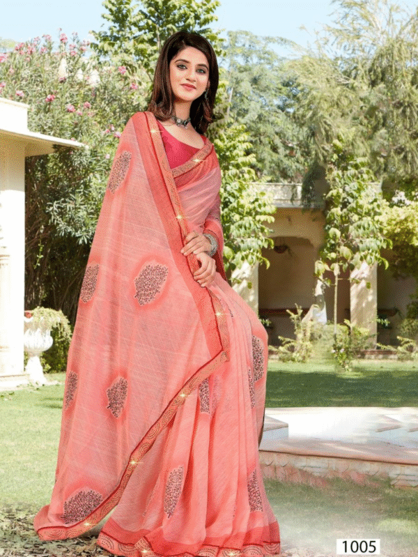 Peach Pink Georgette Saree with Elegant Embroidered Motifs & Shimmer Border