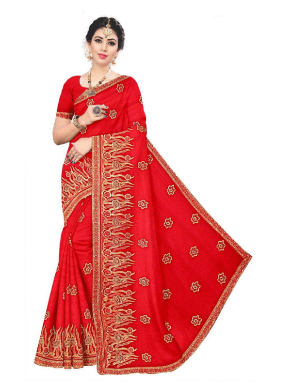 Make a regal statement in this red georgette saree featuring stunning golden embroidery and a matching blouse — perfect for weddings and festive occasions.