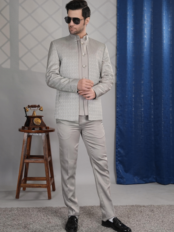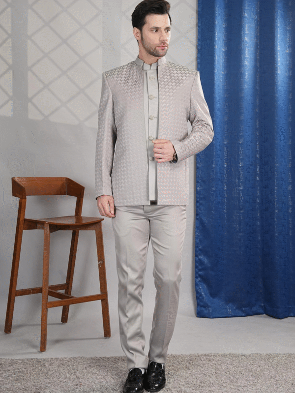 Silver Grey Textured Indo-Western Suit with Mandarin Collar – Elegant Wedding & Party Wear