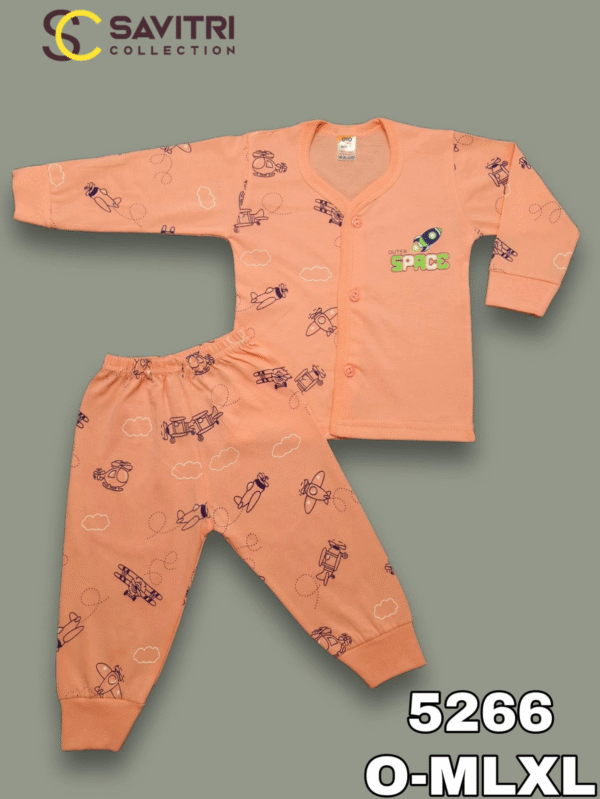 Soft and cozy peach pajama set featuring playful airplane and rocket prints, designed for easy wear and maximum comfort for your little explorer.