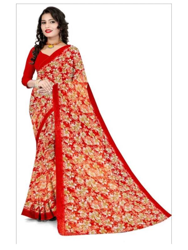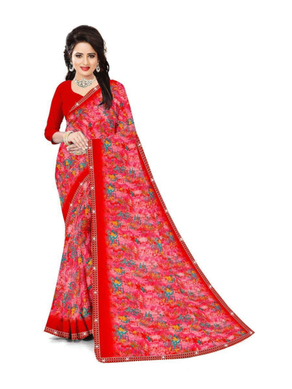 Vibrant red printed saree with colorful floral designs and elegant border — ideal for festive occasions, parties, and traditional events.