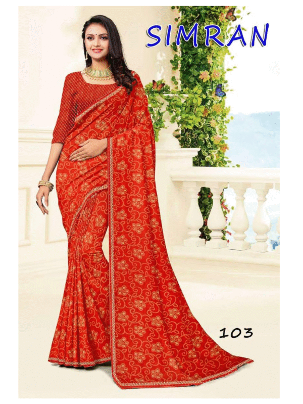 Bring a timeless ethnic touch to your wardrobe with this Simran maroon printed georgette saree featuring an elegant border, soft drape, and matching blouse — perfect for festive occasions and celebrations.