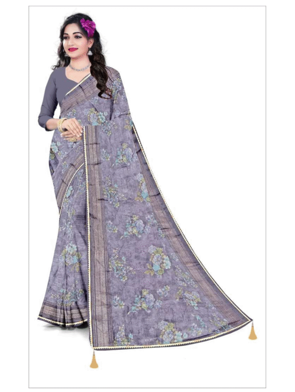 Chic lavender-grey cotton saree with soft floral prints and a classic woven border — perfect for daily elegance and festive charm.
