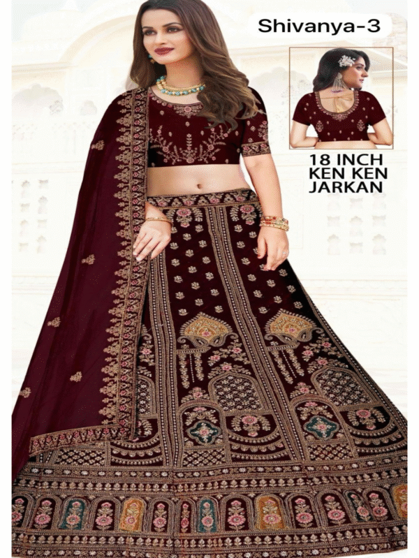 Dazzle in the Shivanya-3 Maroon Velvet Lehenga Choli, crafted with intricate Jarkan and Zari embroidery, complete with an 18-inch Ken Ken flare for a majestic bridal look.