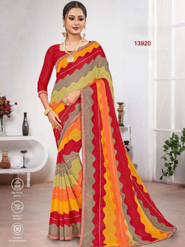 Vibrant Geometric Striped Orange Saree with Green Accents – Festive & Everyday Wear