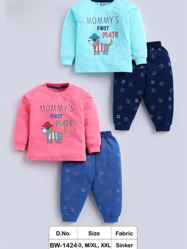 Unisex cotton winter co-ord set featuring a cute puppy “Mommy’s First Mate” print, made with soft Sinker fabric for toddlers and young kids.