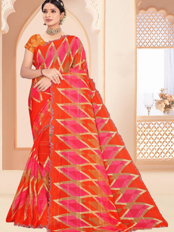 Vibrant Geometric Art Silk Saree in Orange & Pink with Designer Border – Perfect for Festive & Party Wear