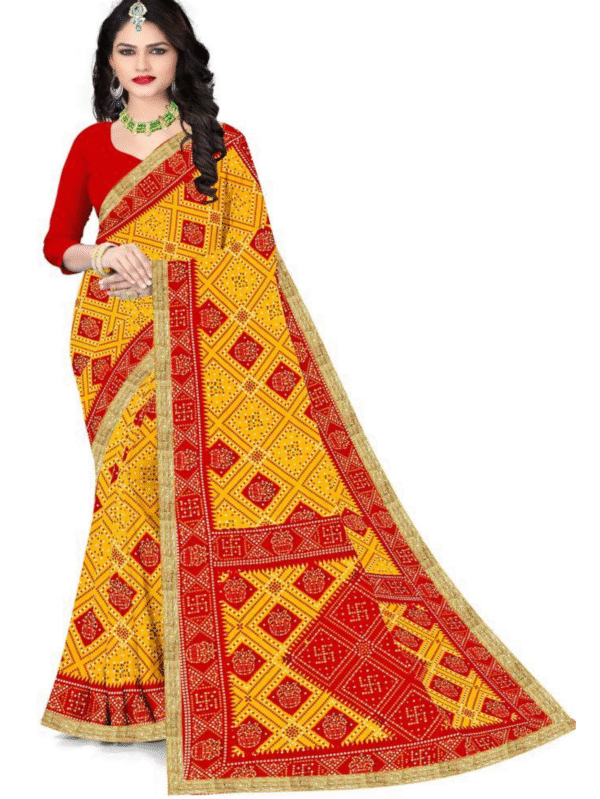 Traditional Bandhej Red & Yellow Festive Saree with Zari Border