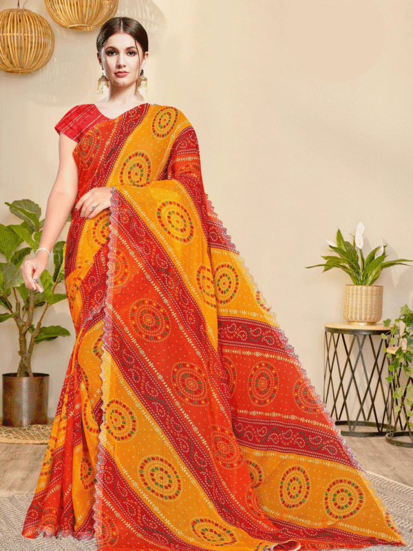 Elegant orange and red Bandhej print saree in lightweight fabric – perfect for festivals, cultural events, and daily ethnic wear with a touch of traditional charm.