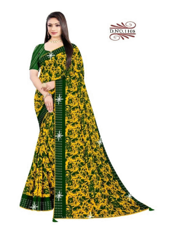 Beautiful mustard yellow saree with striking green border and abstract prints. Crafted from lightweight fabric, perfect for daily wear, office, festive, or casual occasions. Includes matching blouse piece.