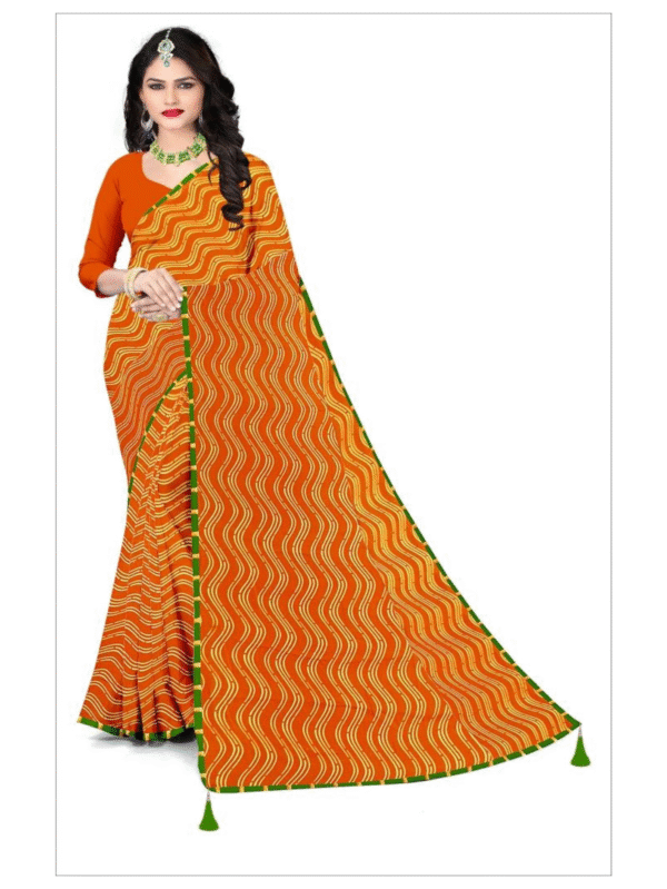 Vibrant Orange Wavy Printed Saree with Green Tassel Border – Elegant Daily & Festive Wear