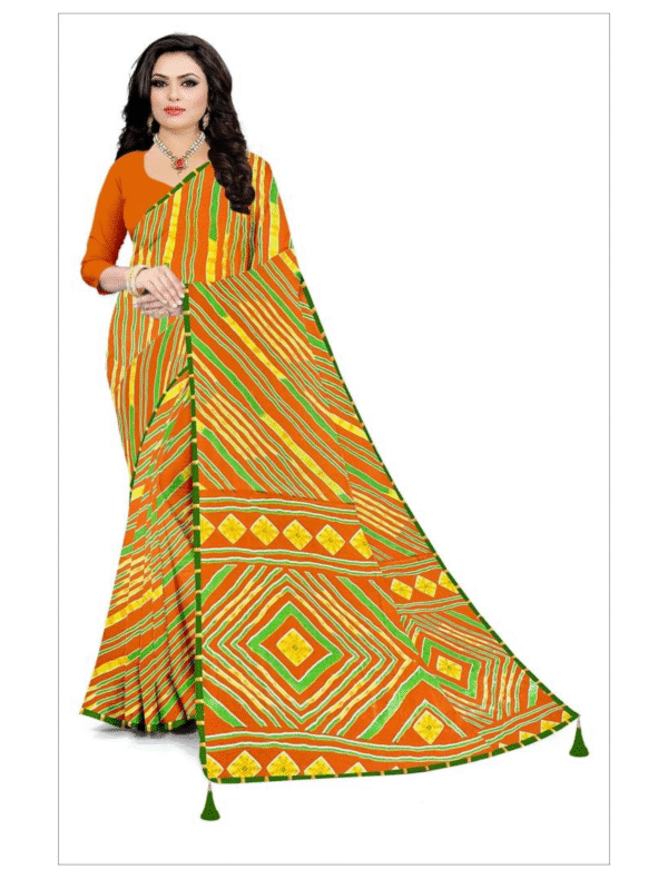 Bright and stylish orange saree with bold geometric striped patterns and green tassel border – perfect for festivals, cultural events, and daily elegance.