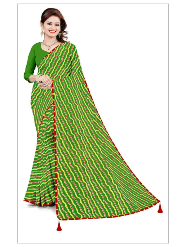 Vibrant Green Striped Saree with Red Tassel Border – Elegant Festive & Daily Wear