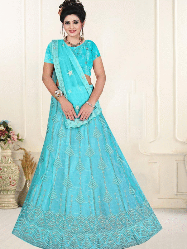 Turquoise Radiance Embroidered Net Lehenga Choli Set – Mantra Collection