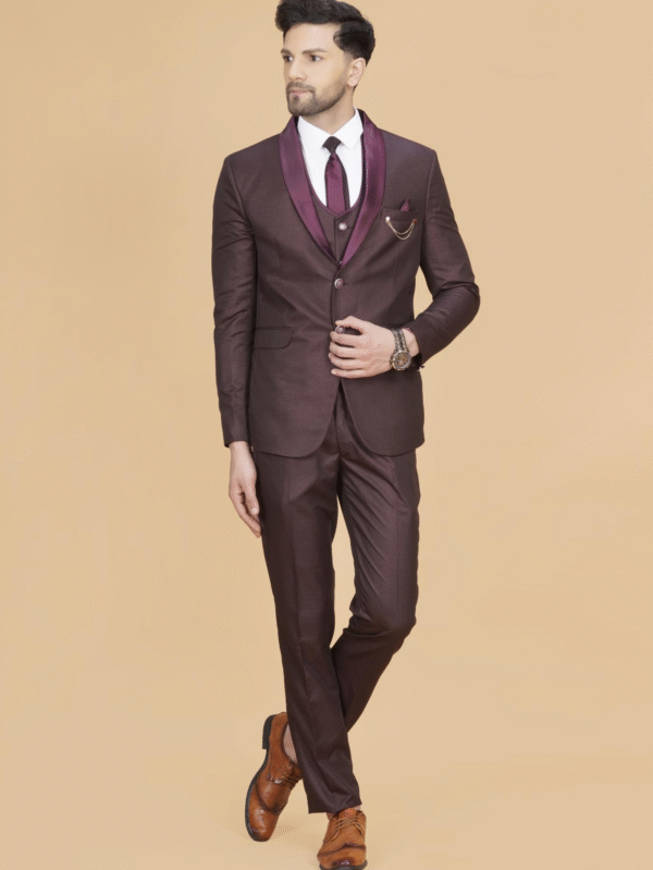 Wine black 3-piece suit with satin lapel, waistcoat & slim trousers. Perfect premium attire for weddings, receptions & parties.