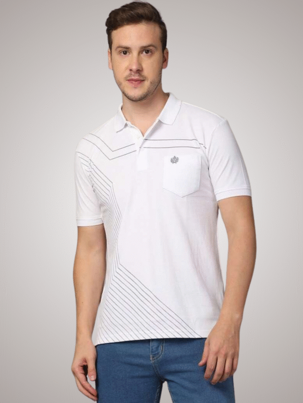 White Polo T-Shirt for Men with Geometric Line Design & Pocket Detail