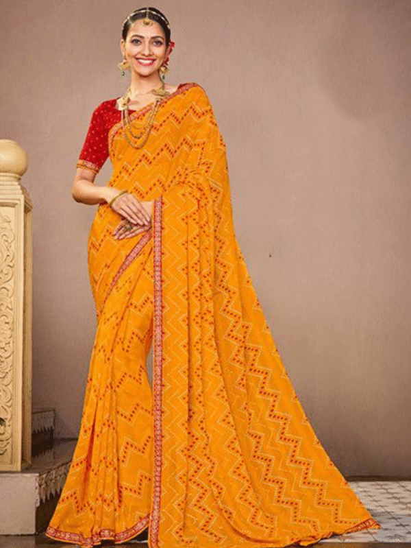 Elegant mustard yellow georgette saree with red embroidered border — perfect for weddings, festive, and traditional occasions.