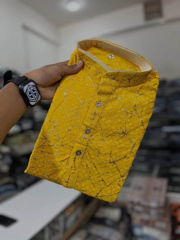 Bright yellow festive kurta with golden abstract print – perfect for haldi ceremonies, weddings, and festive occasions.