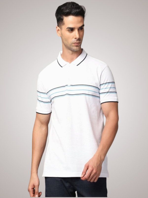 Classic white polo T-shirt with horizontal multi-color stripe design. Crafted from breathable cotton for everyday comfort and style.