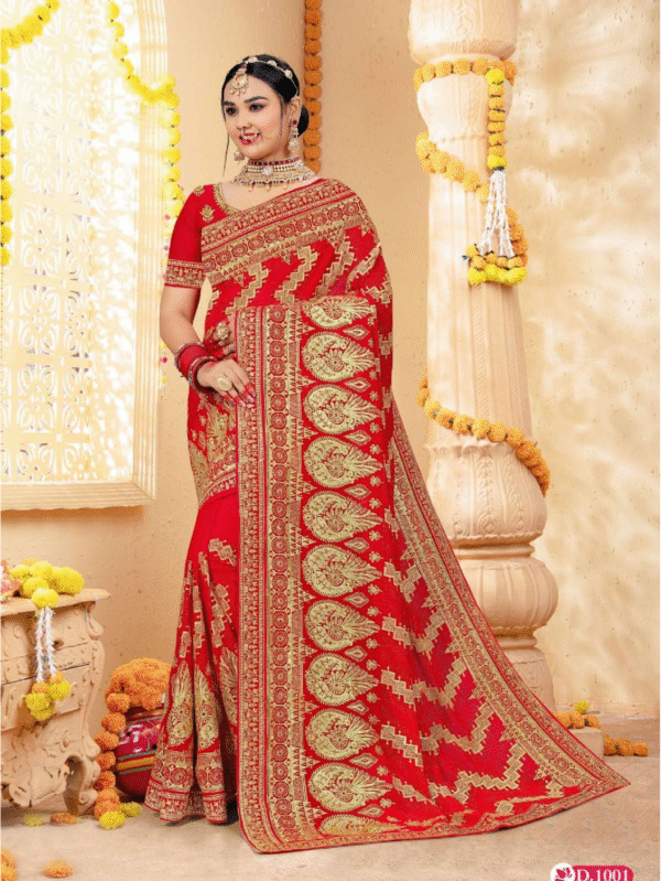Elegant red saree with heavy golden zari embroidery and traditional motifs, perfect for weddings and festive celebrations.