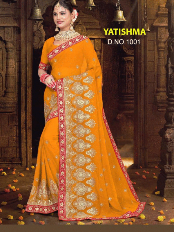 Yatishma D.No.1001 Mustard Yellow Embroidered Georgette Saree with Red Border