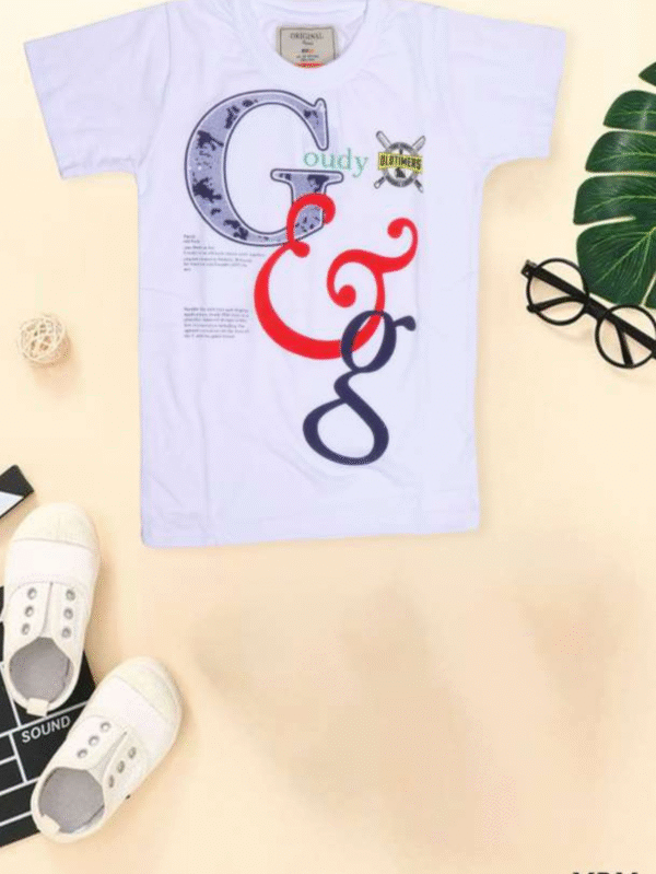 Stylish white t-shirt for boys featuring colorful “G & g” typography print in Goudy font. Made from 100% cotton for a soft, comfy fit—perfect for everyday wear.