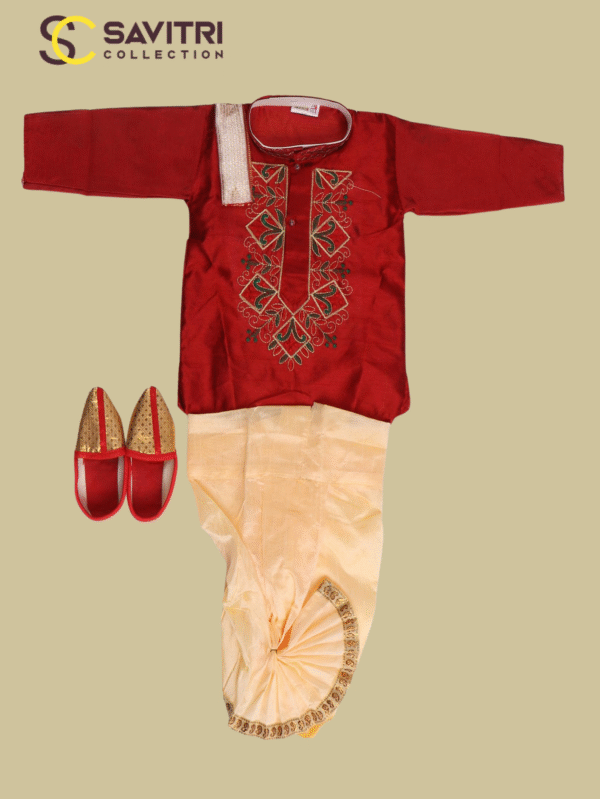 Traditional red kurta and cream dhoti set with embroidery, paired with mojari footwear – perfect for festive and cultural occasions.