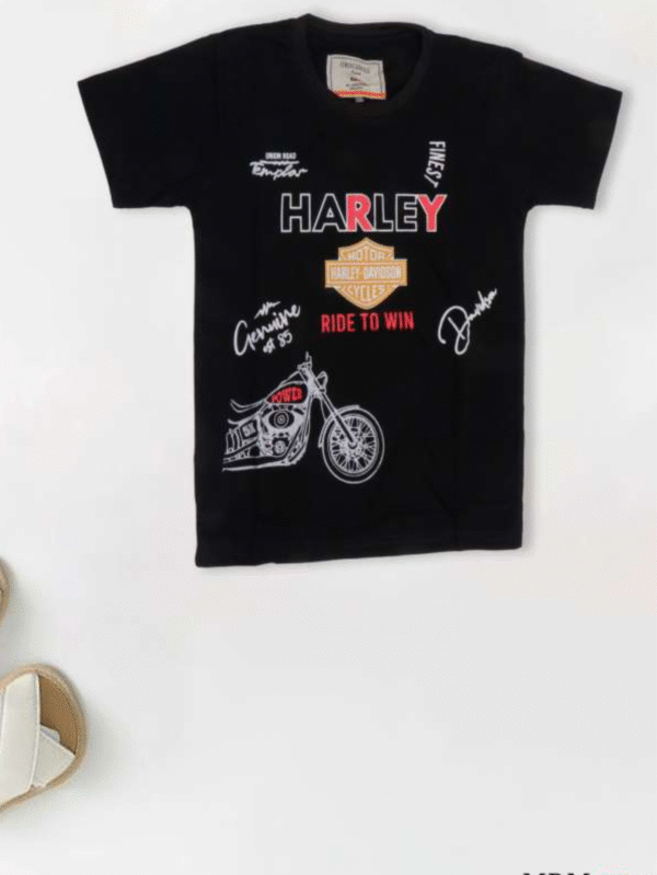 Black cotton t-shirt for boys featuring a Harley Davidson-themed graphic print with a “Ride to Win” slogan. Soft, breathable, and perfect for little adventurers.