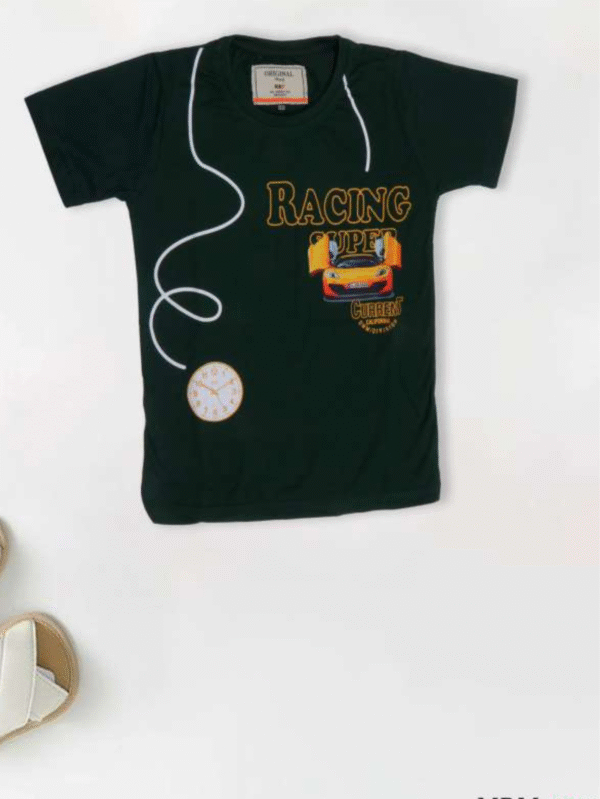 Dark green boys’ cotton t-shirt with “Racing Super” print, race car graphic, and stopwatch detail. Perfect for little car enthusiasts.