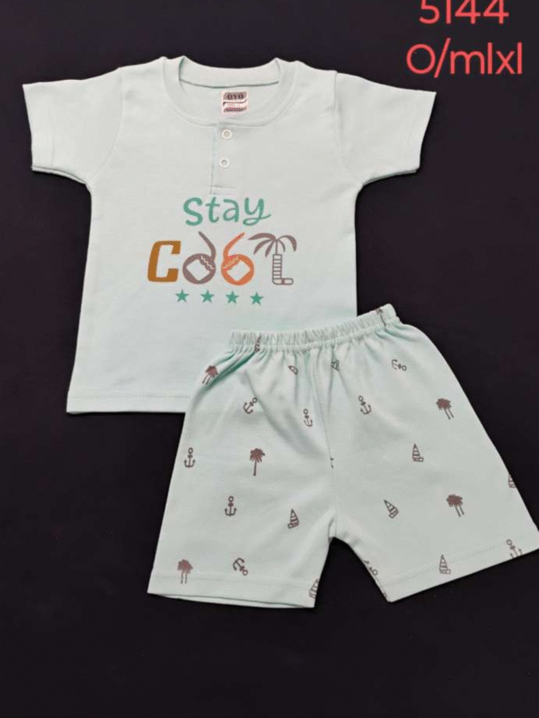 Soft cotton co-ord set for boys featuring a fun “Stay Cool” print t-shirt and nautical-themed shorts. Ideal for summer comfort and style.