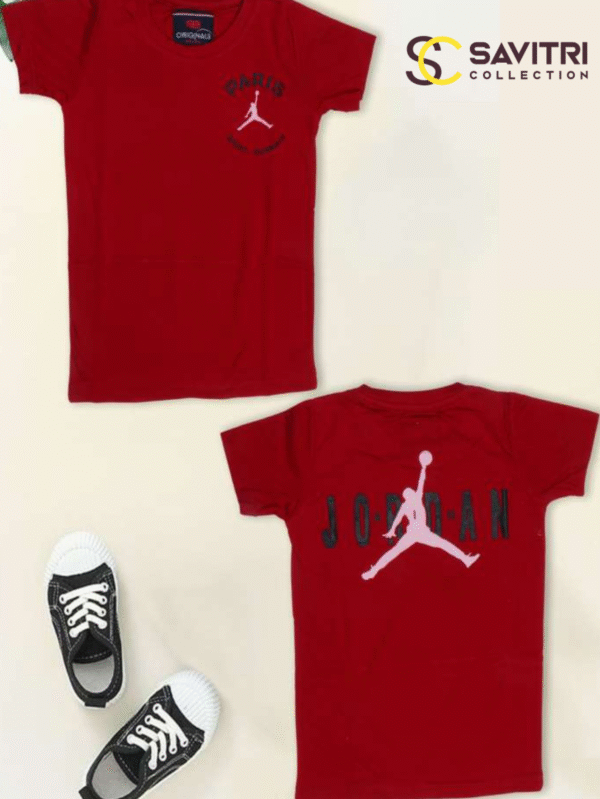 Trendy Kids Red Jordan Paris T-Shirt with chest logo and bold back Jumpman print, designed for sporty style and comfort.