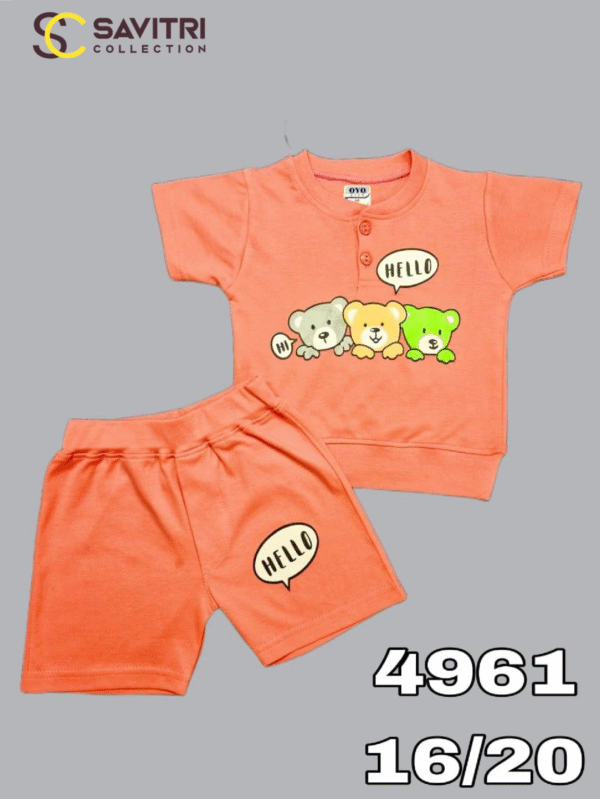 Adorable kids cotton T-shirt & shorts set in peach with cartoon bear print – soft, comfy & perfect for daily wear.
