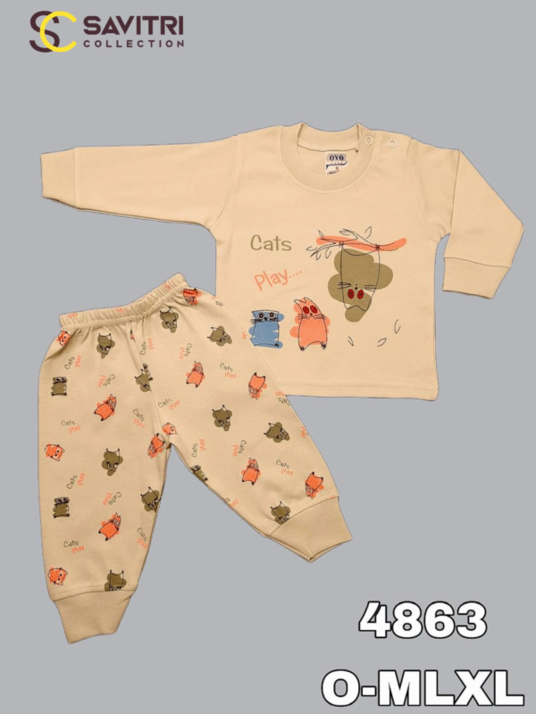 Kids Full Sleeve Cotton Night Suit – Beige Cat Print Set