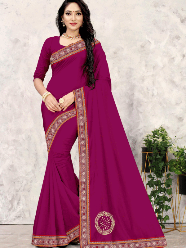 Elegant rani pink satin silk saree with embroidered border and matching blouse — perfect for festive and wedding occasions.