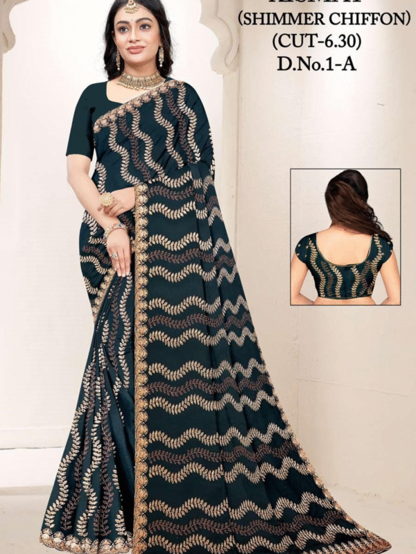 Elegant shimmer chiffon saree in deep teal with golden leaf embroidery and designer border — perfect for festive and party occasions.