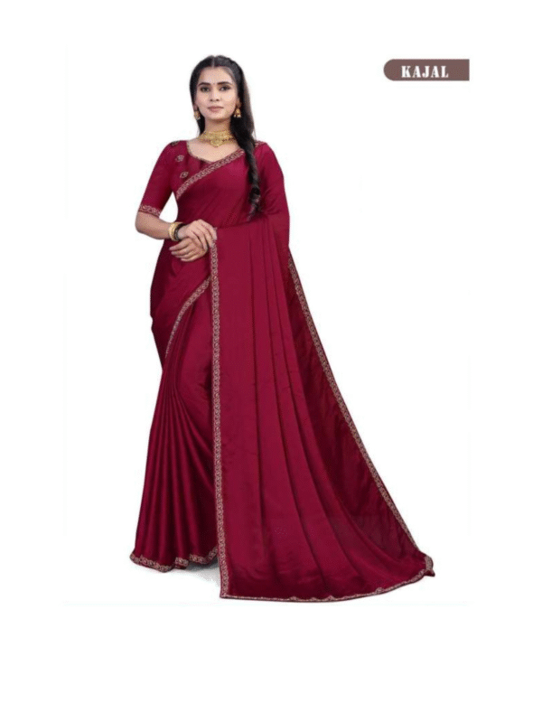 Elegant maroon satin silk saree with embroidered border and matching blouse — perfect for weddings, festive and party occasions.