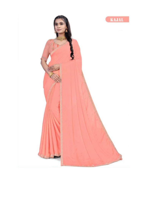 Kajal Peach Satin Silk Saree with Elegant Embroidered Border & Designer Blouse
