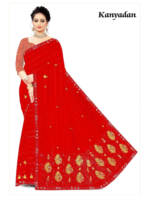 Kanyadan Red Bandhani Printed Saree with Golden Motifs – Rimzim Collection