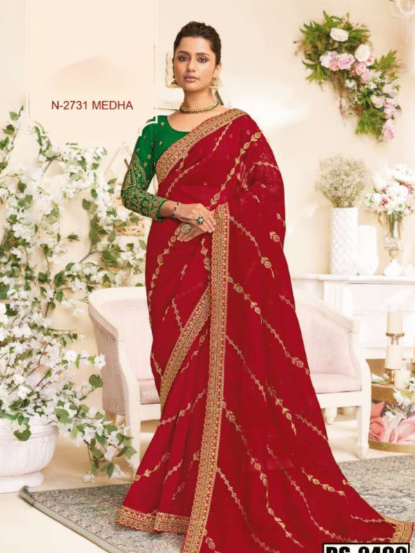Medha N-2731 designer saree in rich red with golden embroidery and contrasting green blouse. Ideal for weddings, receptions, and festivals.