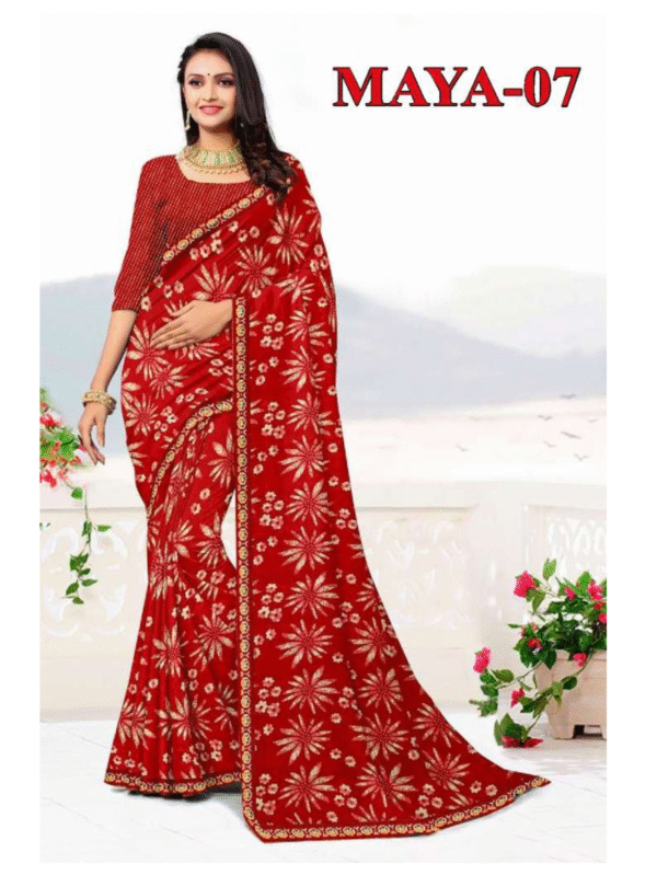 Make every occasion special with this Maya-07 traditional red printed georgette saree featuring golden floral motifs, a detailed border, and a matching blouse — perfect for weddings, parties, and festive events.