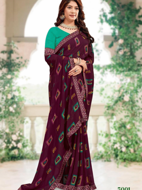 Stylish maroon saree with vibrant geometric prints and a contrasting green blouse. Soft fabric, elegant drape — perfect for festive and semi-formal occasions.