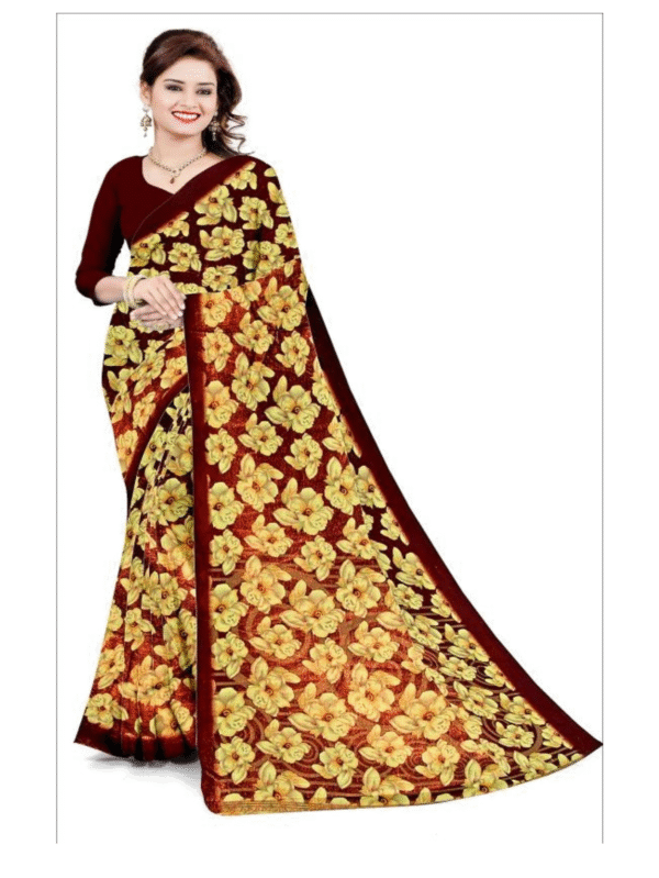 Make a bold style statement with this maroon floral printed georgette saree featuring vibrant yellow blossoms, soft fabric, and a matching blouse — perfect for weddings, parties, and festive occasions.