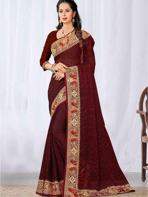 Majestic Maroon Shimmer Saree with Golden Embroidered Border & Paisley Motifs